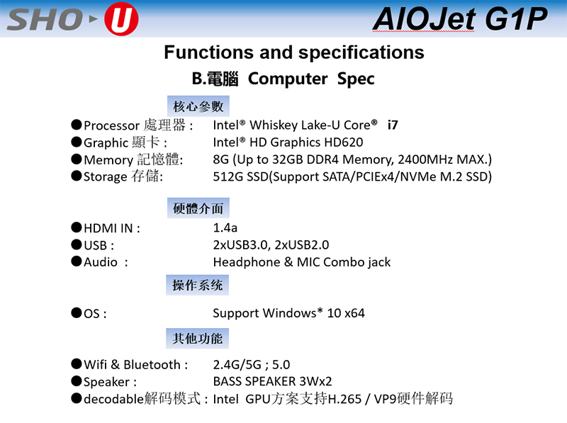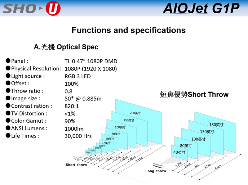 產品名稱 AIOJET 智投一體機 型號 G1P 光機類型 DLP 晶片 TI 0.47” 1080P DMD 物理分辨率 1080P (1920 X 1080) 光源 RGB 3 LED 偏軸 100% 投影比 0.8 投影尺寸 50”@ 0.885m 對比度 820:1 色域 90% 流明 1000lm LED壽命 3萬小時 光機尺寸 178*114*51mm 電腦規格 CPU i7-8565U/GPU Graphics 620